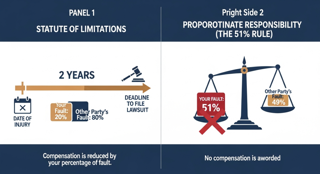 Texas law sets a strict two-year deadline for filing most injury claims and follows a ‘proportionate responsibility’ rule for shared fault.